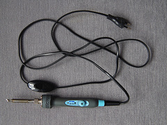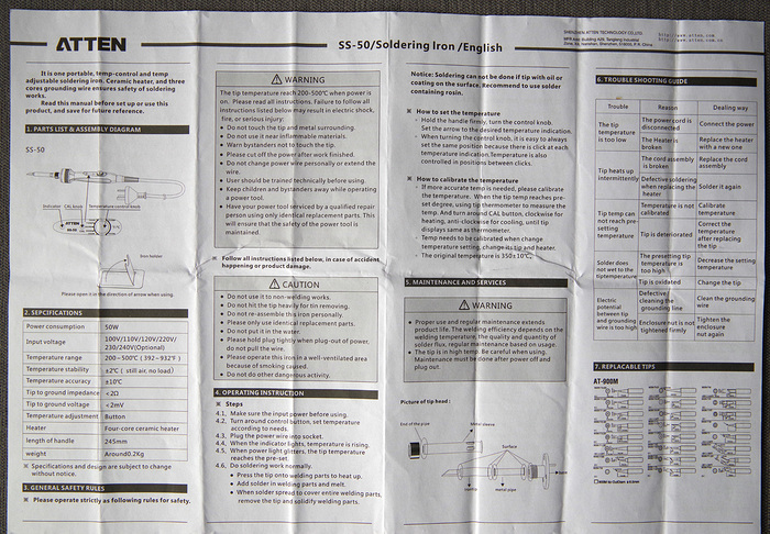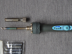 Некогда флагман в своем классе) Керамический нагреватель. Мощность: 50 Вт. Комплект: паяльник, набор жал, подставка, инструкция на английском. Из плюсов: отличный внешний вид, нескользящий пластик, возможность регулировки температуры, супер мягкий кабель с выключателем. Рукоятка во время работы не греется. 700 руб